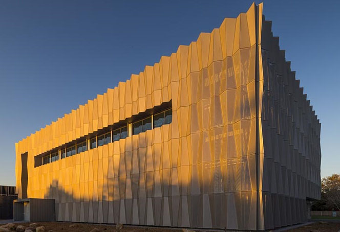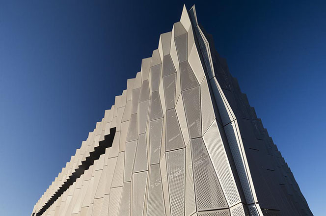 Massive façade of perforated anodised aluminium panels, with giant gill-like slits