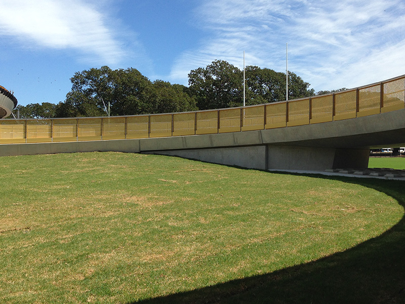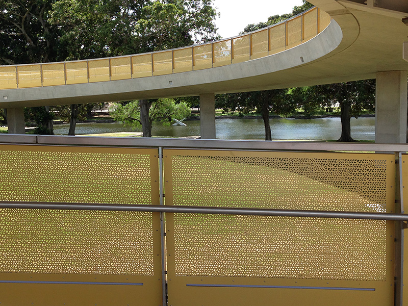 The bridge was designed to ferry pedestrians safely over Anzac Parade. Satin Oriental Gold the chosen colour.