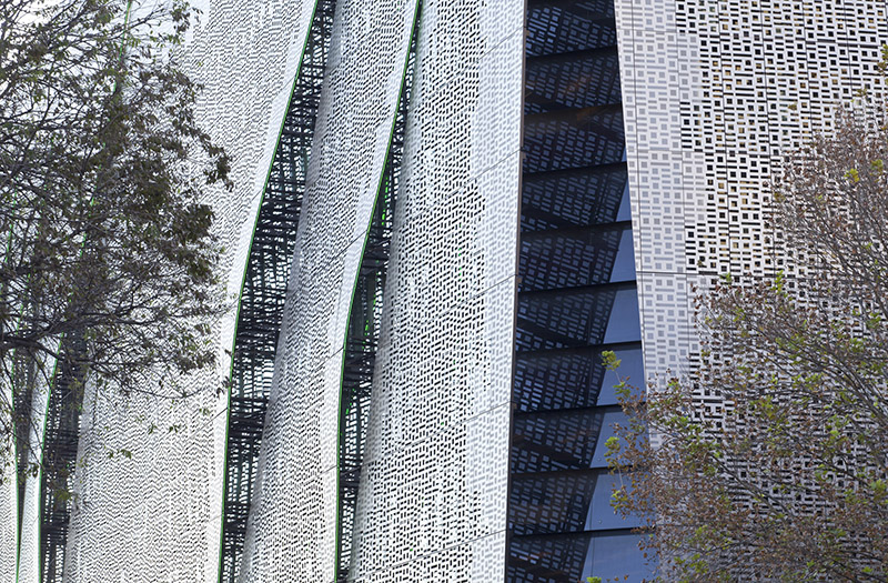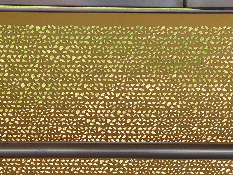 Hassell’s inspiration for perforation came from the dappled light of the fig leaves on Anzac Parade. The golden tones of the morning sun are depicted in the finish