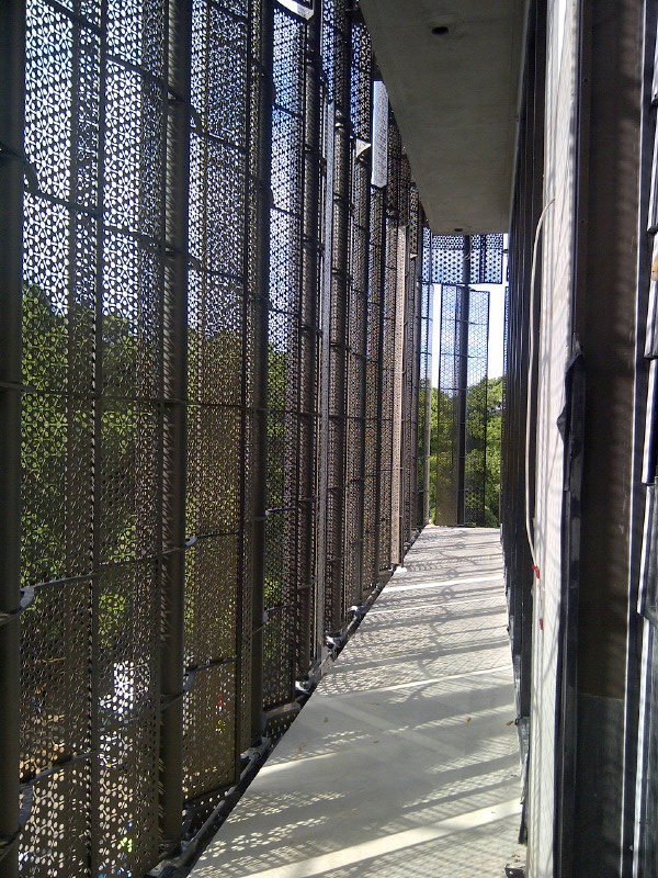The perforated panels allow light into stairwells without distorting the façade.