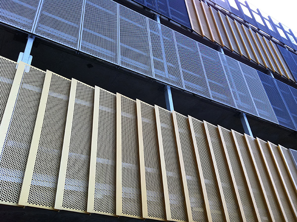 Close up shot show the perforated, folded aluminium screens anodised in several golds