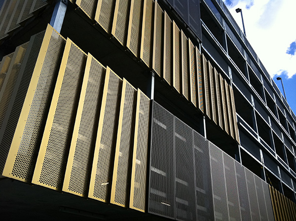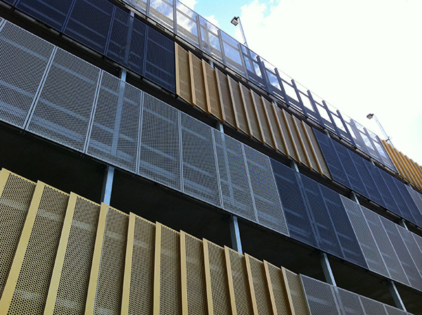 Revesby Car Park - Perforated anodised sheet Oriental Gold – Charcoal and Silver Grey Panels